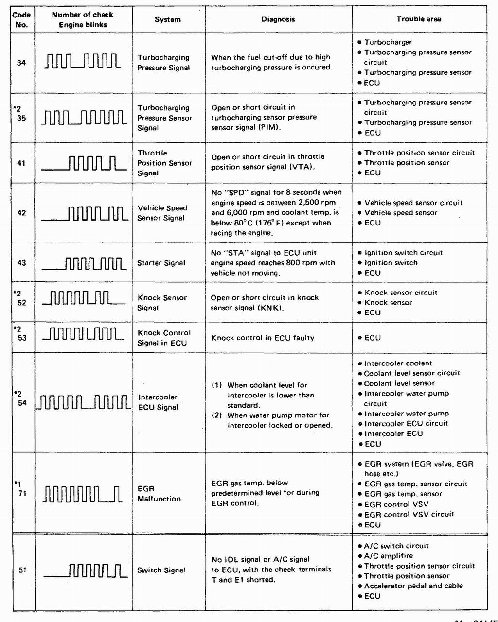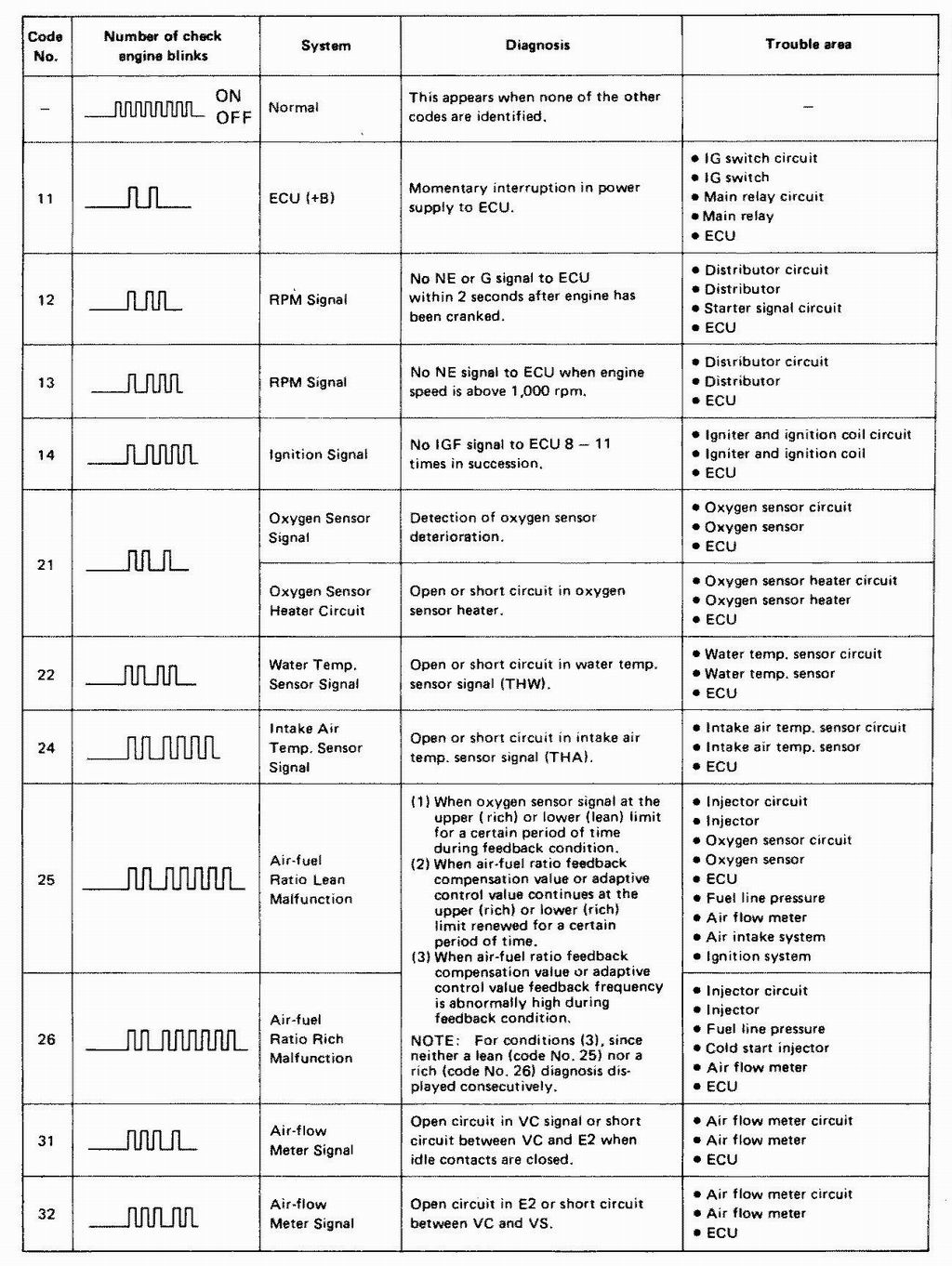| 13 - RPM | No "NE" signal to ECU above 1000 rpm | Check distributor, ECU |