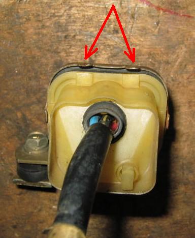 Undo the relay mounting bolt and remove the relay from the wiring loom. Turn the relay upside down and prise the metal clasps away from the side of the relay. Pull off the plastic cover, this seems like it won't budge, but that's only because it is stuck to the rubber gasket - give it a firm tug! Now you can see the wires coming from the bottom of the relay. Connect the two wires together - black/yellow to the red wire.