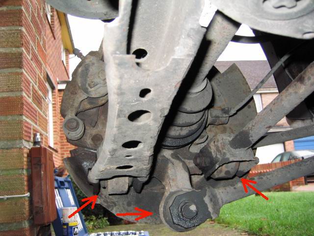 | Undo the trailing arm (strut rod) - secured between hub and in front of wheel arch Undo the front radius arm (No 1 suspension arm) - note this sets the toe in and out for the rear wheel. I didn't bother marking this up, seeing as though bushes etc will be replaced and will end up misaligned anyhow. This is awkward to remove and later replace. Some persuasion with screwdrivers / wrecking bars used as levers will help as this is recessed into the rear sub frame. Note that the fixing to the sub frame can only be undone BOLT end Undo rear radius arm (No 2 suspension arm) - straightforward It is preferable to remove the arms at the hub but in practice I found this difficult and undid the most accessible nut/bolt * Note that the nuts securing the arms have a metal "wing" so that you can "simply" undo them from the bolt side. In practice these were ball bouncingly difficult to remove, a breaker bar and a length of scaffolding pole will be required to shift them. Note the metal "wing" simply bent under the pressure Remove the brake calliper - undo 2 bolts at rear of disk and tuck the calliper out of the way |