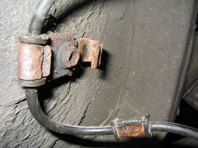 | Located on the front of the wheel arch is the mounting for the ABS sensor wiring. The bolts were seized and rusty. Best way to remove the cable is to lever up the clamps. Next pull out the rubber grommet and pull through the sensor wiring | |