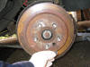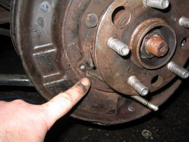 | To remove the rear disk, remove the rubber grommet from the disk in order to access the handbrake adjuster. Align the hole with the adjuster, (need a torch), and turn the adjuster to withdraw the shoes from the disk. The disk can then easily be pulled free. Note the hub nut, nut retainer and split pin should already have been removed by this stage (photo taken during a later brake adjustment) | |