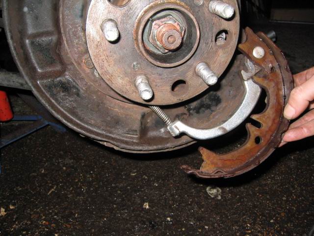 | Remove handbrake brake shoes, and detach handbrake cable from shoe | |