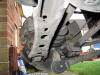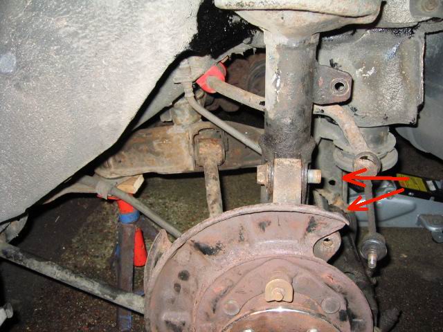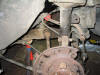 | Undo the 2 suspension leg bolts. Take care that the bottom of the suspension leg does not hit or damage the CV boot - there's not much room. Do not push the bolts out from the suspension leg/hub with your finger, you might loose your finger! | |