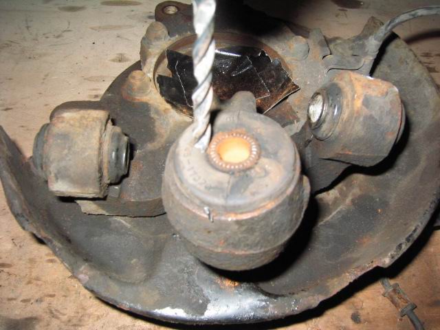 start with, but they will come out with some "gentle" persuasion First smash through the centre portion of the bush. This has a plastic mounting and is surprisingly difficult to break, but it will eventually come - hit it hard! Apply heat to the outside of the hub and freezing spray to the inner side and hit the bush with a suitably sized socket. The bush will very slowly begin to move |