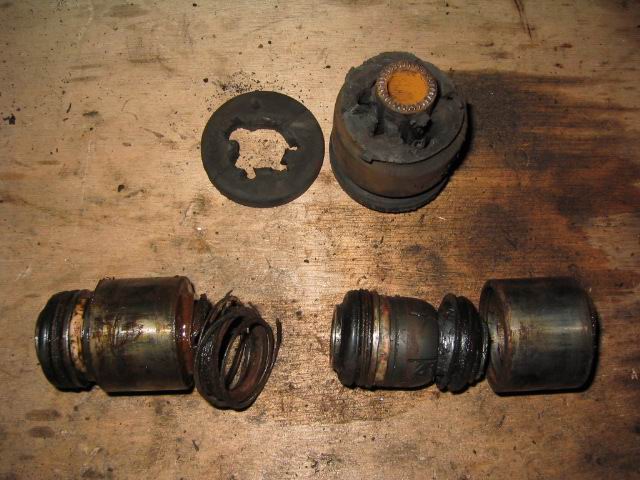 | The three removed bushes, note the lower 2 spherical bushes and the solid rubber bush | |