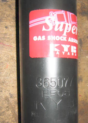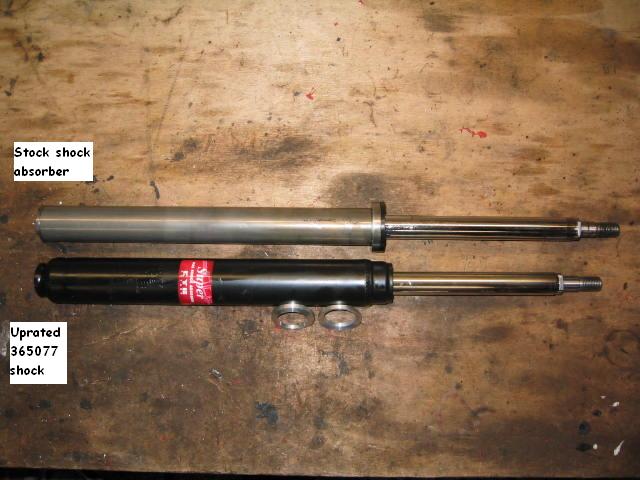 | The old and new shocks. You can clearly see the difference in length between the stock shock and the KYB 365077, that's why you need the "domed" spacer (supplied as part of the kit when bought through Fensport). This shock is a direct fit for the 185, no space should be utilised when assembling the suspension leg. | |