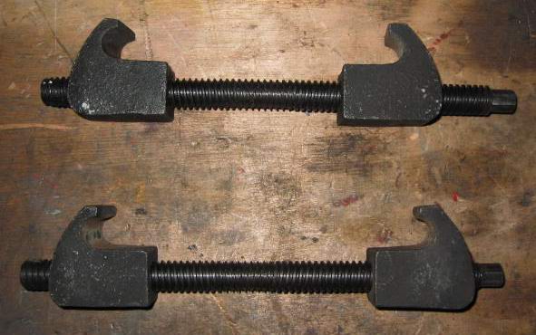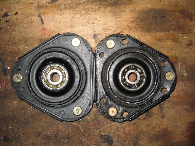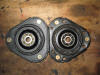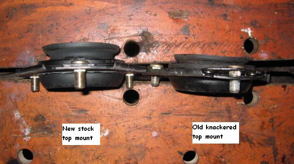 | Before refitting the springs etc examine the condition of the top mounts. The picture shows old and new top mounts; on the right the old ones are considerably smaller that the new ones. Also the bearing wears with use. To check the wear this pop the mount onto the shock and try to rock this from side to side, any movement indicates a knackered top mount, get a new one! The bearing cannot be replaced on it's own, the whole top mount must be replaced | |