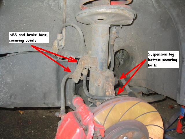 | Remove the wheel, chock the car and stick in a couple of axle stands. Undo the brake pipe from the suspension leg and then the calliper, feed it up and out of the "loop" on the leg and reattach it back to the calliper to stop it dripping everywhere. Unbolt the ABS securing bit. Loosen both bottom suspension leg bolts and remove 1 of the bolts. Note do not push the bolts through with your finger, you might loose it if the car or strut moves! | |