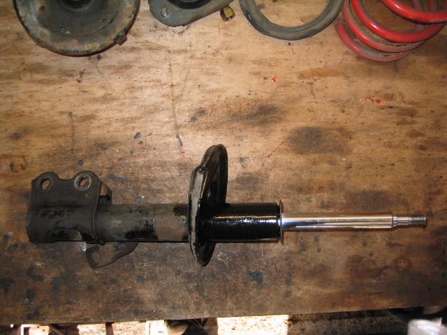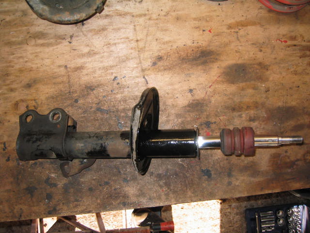 | I treated the top of the suspension turrets for rust, these are the same as the rears and totally missed by rust proofing by Toyota... I cleaned up the suspension leg from loose rust and gave it a coat of anti-rust and Hammerite before I reassembled it. |