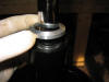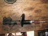 | Once the spring has been removed, pull off the bump stop and unscrew the large nut at the top of the shock in order to pull the shock out from the suspension leg. I removed the large nut by clamping this in a vice and then turning the shock with large screwdrivers placed in the bottom bolt holes. Be careful to keep the shock straight to avoid damaging the top nut and making the job a nightmare. Lubricate the nut copiously and turn forwards and backwards to ease it out without damaging anything...A very small amount of pressure was released on breaking the seal between the shock and top nut, wear goggles to prevent any accidents | |
