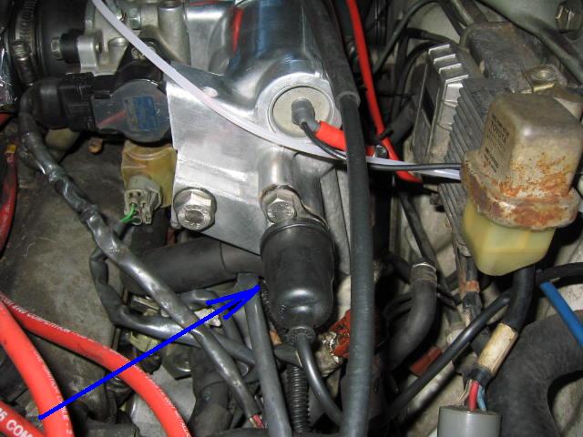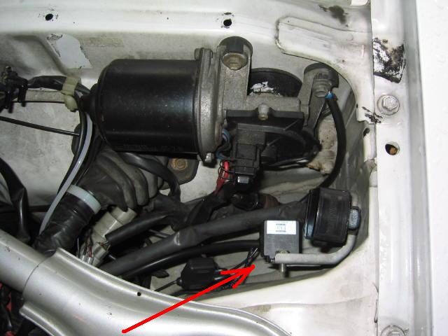 | The switched ignition voltage can be picked up by pushing the wire through the big rubber boot and down by the ECU. I connected in a fuse into this line and have run several devices from it that require to be "told" when the ignition key is turned. The fuse is arrowed | |