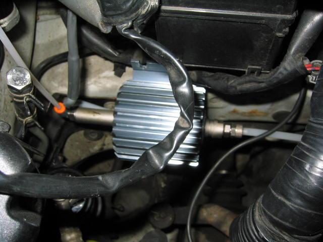 | The pump requires a fair amount of power. In order to control this power a relay needs to be installed. I fitted mine where the fuel pump resistor used to be. If you've relocated your battery then this is a brilliant place - out of the way, secure and close to a point where you can easily tap into the battery. The wiring loom for the WI isn't particularly long and this point is excellent to provide power to the pump and enough reach to the pressure switch. Relay indicated | |