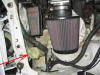| Next up is the water reservoir. I got a windscreen wiper bottle from another 165. Cut a hole through the inner wing and fed up the bottle. The advantage of this is a large water reservoir - 5litres - ish, out of the way, in a cold place, and very close to the pump. The pump should be as close as possible to the reservoir as it isn't made to "suck" water, it's made to push! I applied some Araldite and stuff so that 1 of the holes was blocked and the other could seal the pipe for the water feed to the pump. In order to mount the reservoir here you will need to remove all the crap in the inner wing i.e. the resonator - picture. Also to mount this here you will need to relocate the battery to the boot. You can use the existing windscreen wiper reservoir but I am not a fan of this method... | |