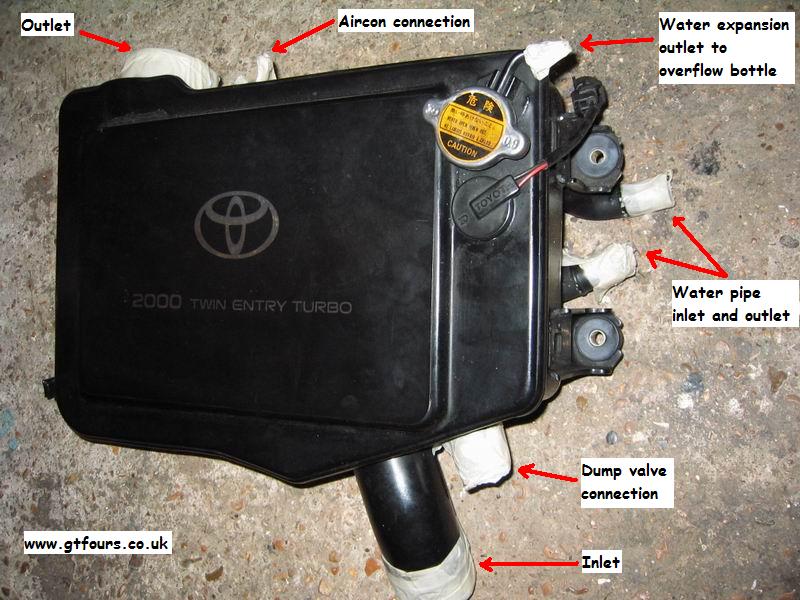 | CS IC pipe work | CS IC radiator | Top of 205 IC | Annotated view. Connections were taped over to prevent dirt ingress |