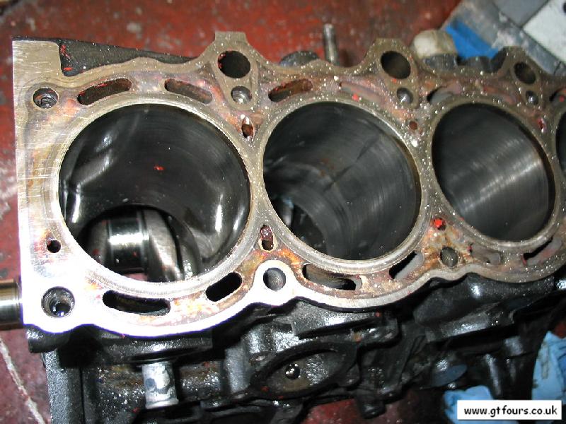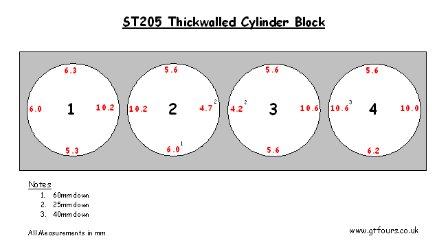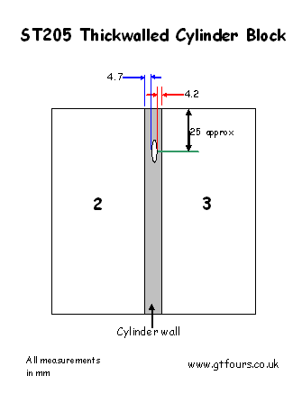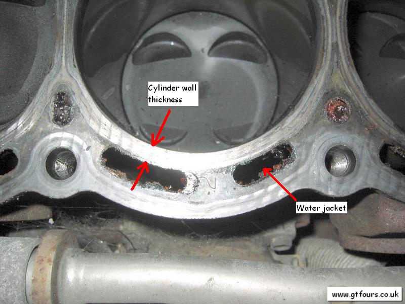A thin Block is considered to have an area between cylinders 2 and 3 <3.8mm. The difference seems to be quite obvious between a thick and thin Block as the cylinder wall can be extremely thin, maybe down to 2.3mm!! Note that all cylinders should be measured, but particular care is to be given to between cylinder 2 and 3 and the rear of cylinder 4.